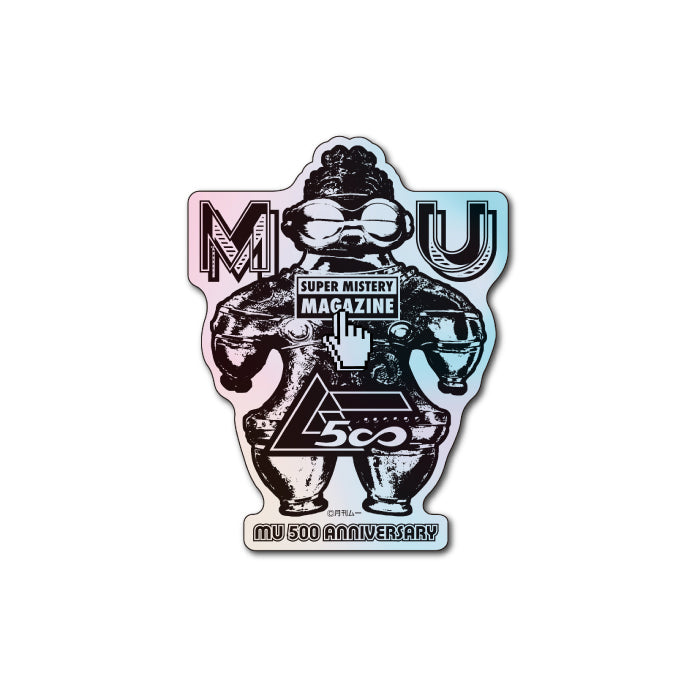 遮光器土偶のホログラム仕様ステッカーです。一説には「縄文時代に飛来した宇宙人(宇宙人飛行士)」という説もある姿をその手に! 創刊500号記念デザインです。