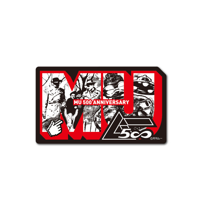 大胆な「MU500」デザインの背景に、「囚われた宇宙人」のビジュアルが描かれたステッカー。創刊500号記念デザインです。